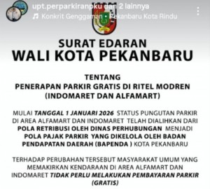 PEKANBARU- Pemerintah Kota Pekanbaru menetapkan kebijakan parkir gratis di area ritel modern seperti Indomaret dan Alfamart mulai 1 Januari 2026. Kebijakan tersebut tertuang dalam Surat Edaran Wali Kota Pekanbaru yang beredar mengatur perubahan sistem pungutan parkir dari retribusi yang sebelumnya dikelola Dinas Perhubungan (Dishub) menjadi Pajak Parkir di bawah kewenangan Badan Pendapatan Daerah (Bapenda) Kota Pekanbaru.